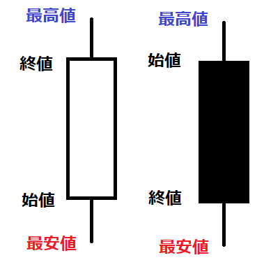 左のローソク足に注目すると始値と高値を比較すると始値<終値となっております。見ての通り、始値と終値のローソク足の労に当たる部分が白色になっております。